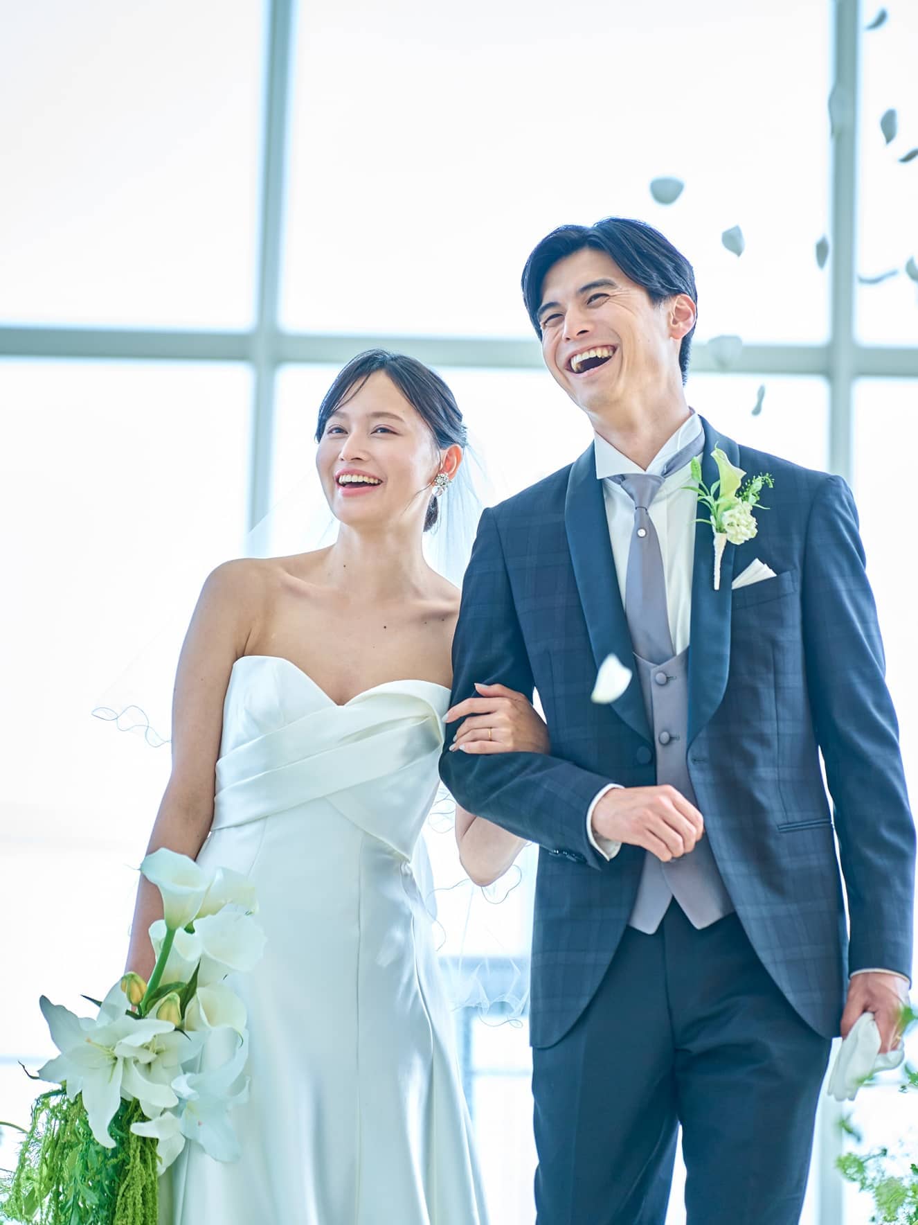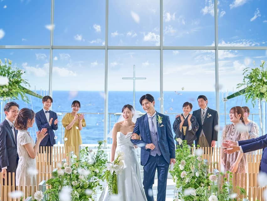 まるで空や海に溶け込むような3面ガラス張りの開放感あふれるチャペルは、カジュアル感と高級感を併せ持つ、シンプルでセンスフルな雰囲気の会場は、新郎新婦だけでなくゲストにも大好評。