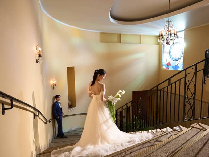 チャペルへと続く動線には優美な螺旋階段があり、花嫁さまの後ろ姿が美しく映える人気のフォトスポットです。